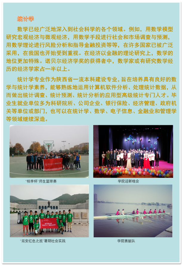 学院现有数学博士学位授权一级学科点、统计学硕士学位授权一级学科点、应用统计硕士专业学位授权点,数学博士后科研流动站,以及数学与应用数学(国家级一流本科专业建设点)、信息与计算科学(国家级一流本科专业建设点)、统计学(陕西省一流本科专业建设点)3个本科专业,并招收旨在培养拔尖创新型复合人才的数学基础拔尖班。学院目前设有4个系、1个研究中心、1个研究所。现有教职工 127人,其中专职教师116 人,包括国家级领军人才1人、国家“新世纪百千万人才”1 人、国家级教学名师1人、教育部教指委委员1人、跨世纪优秀人才 1人、新世纪优秀人才2人、享受国务院政府特殊津贴2人、陕西省人才计划2人、陕西省师德楷模1人、陕西省高校青年杰出人才1人、陕西省科协青年人才托举计划入选者4人。