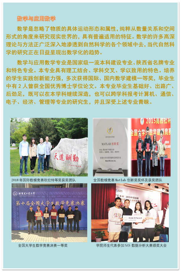 学院秉持“教学奠基、学科立院、科研兴院、人才强院”的办学理念,以建设海内外知名的特色鲜明学科为目标,学院坚持教学科研并重,注重跨学科交叉研究,着力加强国际化和信息化建设,各项工作取得了长足发展。近三年,在国际数学顶级期刊Advances in Mathematics 发表长文;发表SCI论文339篇,其中一区论文12篇,二区论文99篇;2019年度入选ESI 高引论文8篇,入选年度中国百篇最具影响国内学术论文1篇,获得陕西省科学技术一等奖3项、西安市科学技术二等奖1项、陕西青年科技奖3项 、吴文俊人工智能优秀青年奖1项、陕西省高校科技一等奖2项。学院负责全校本、硕、博数学公共课教学和数学建模教育与竞赛培训工作。现有国家级教学团队1个、省级教学团队2个,国家精品资源课程2门、陕西省精品资源课程4门,出版国家级规划教材2部,先后获得国家级教学成果奖3项、省级教学成果10多项。指导学生参加数模竞赛,共获国际及国家级奖励300余项,包括国际数模竞赛Leonhard Euler Award 冠名特等奖1项、国际数模竞赛特等奖3项,全国数模竞赛 MATLAB 创新奖1项,获奖层次和数量在全国高校中位居前列。