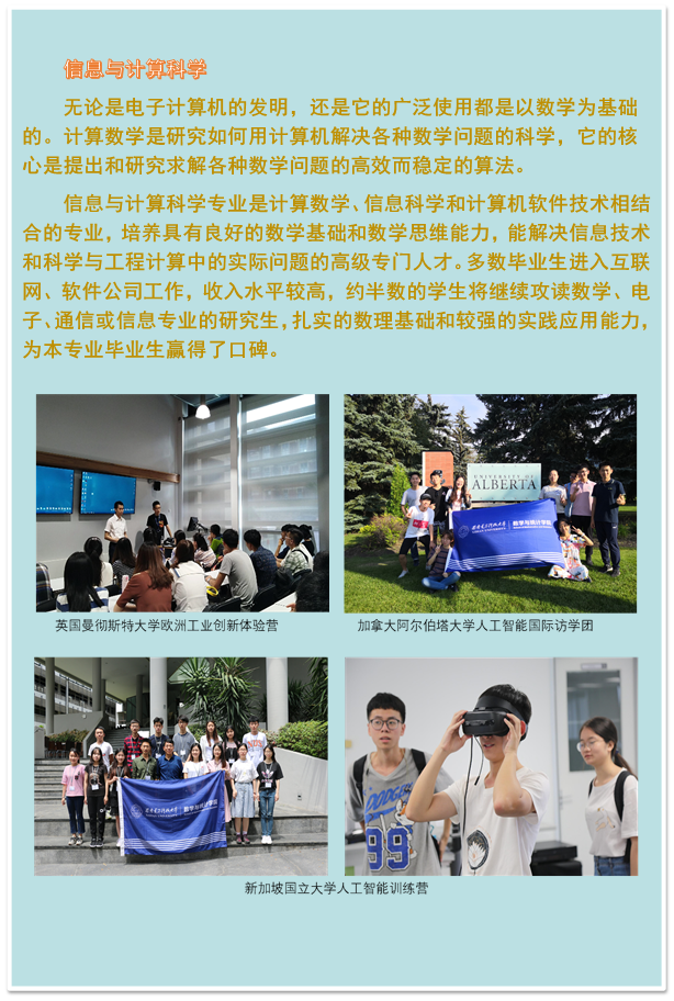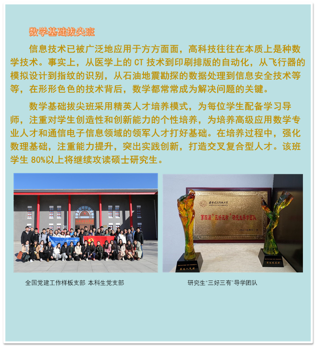 历经多年发展,学院一级学科、二级学科门类齐全,博士点实现数学一级学科全覆盖,硕士点实现二级学科全覆盖。其中,应用数学学科是全国首批硕士点之一,是1996年全国数学学科唯一新增的博士点、西北地区第一个应用数学博士点、陕西第二个数学学科博士点,全校第一个理科博士点。数学学科近三年均入选上海软科发布的 “中国最好学科排名”,2019年排名进入前20%。对于优秀的本科生、硕士生、博士生学院推荐参加国家留学基金委资助的海外访学、联合培养、攻读学位等专项项目。