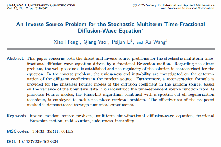 近期,永利集团88304冯晓莉副教授,研究生姚强和中国科学院数学与系统科学研究院李培军研究员,王旭副研究员合作,在随机微分方程反随机源的理论分析和数值计算方面取得新进展,相关结果发表在美国工业与应用数学学会旗下重要期刊SIAM/ASA Journal on Uncertainty Quantification上 [Xiaoli Feng, Qiang Yao, Peijun Li, Xu Wang, An inverse source problem for the stochastic multi-term time-fractional diffusion-wave equation, SIAM/ASA Journal on Uncertainty Quantification, 13(2), 518-542, 2025]。