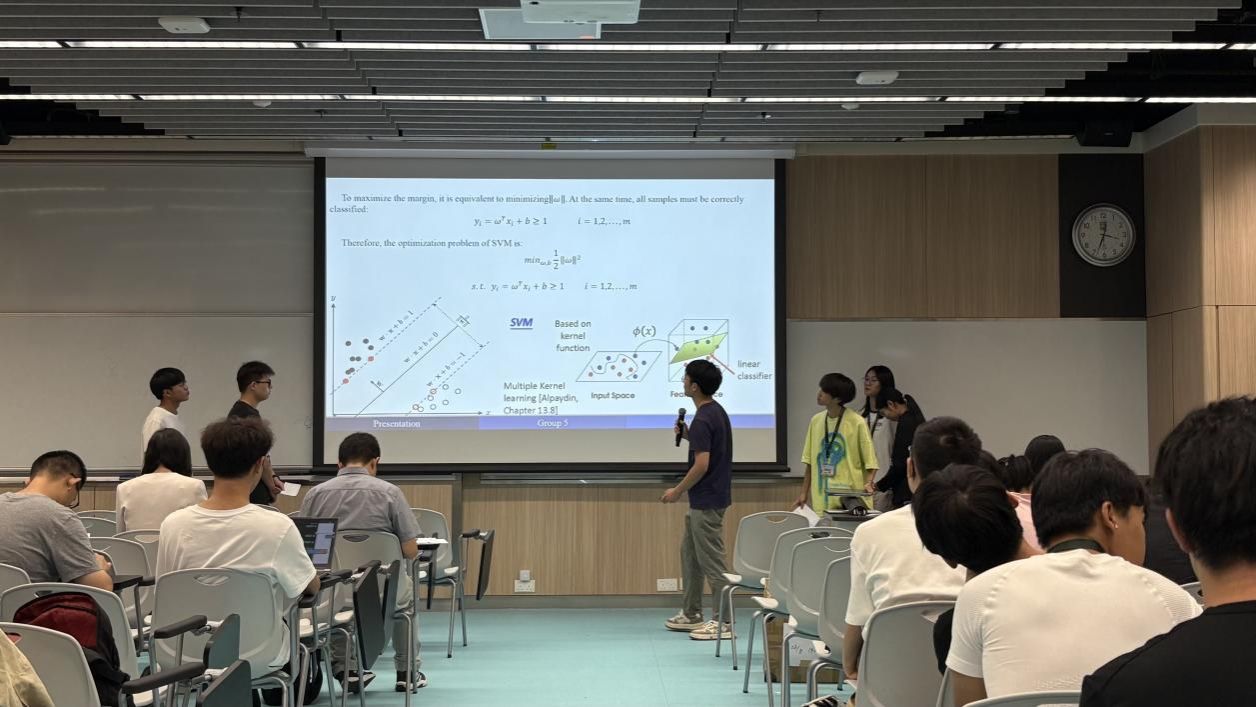 此次访学的课程内容紧扣“数学与商业融合”主题,涵盖金融数学与量化分析、人工智能与机器学习、数据处理与大数据分析、商业智能与财务战略等多个交叉领域。授课团队由香港大学数学系和中国商业学院的多位专家学者组成,包括张智文副教授、杨仕名先生、黄彩屏博士和李锐博士等。老师们结合学术前沿与实际案例,深入浅出地讲授了时间价值、风险管理、算法交易、人工智能决策模型、数据挖掘与商业智能应用等内容。课堂上采取互动式与小组合作相结合的方式,学生们踊跃提问、积极参与讨论,展现出扎实的学科基础与开放的学术思维。