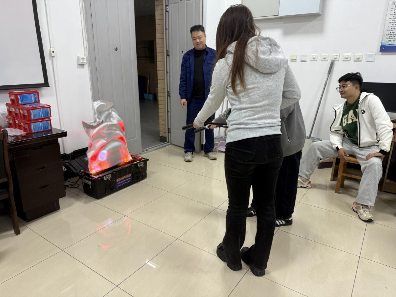 在消防安全专项环节,驻校专职消防员带来了专业且实用的培训内容。消防员结合实验室常见火灾隐患(如电路老化、试剂易燃、设备过载等),讲解火灾预防要点、初期火灾扑救技巧及疏散逃生注意事项,重点演示了二氧化碳灭火器的适用场景与操作步骤(提、拔、握、压),并在随后的灭火演练中,新生们分组上阵,在消防员的现场指导下,亲手操作灭火器扑灭模拟火源,从“理论认知” 转向“实战应用”,切实提升了火灾应急处置能力。