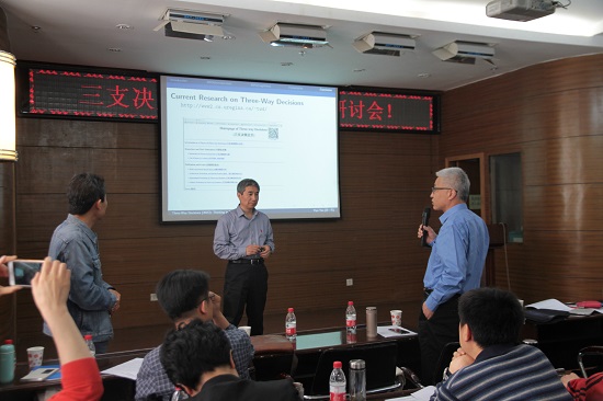 6日上午共有三个大会报告:分别为苗夺谦教授的《基于知识约简的知识发现研究》,重庆邮电大学于洪教授的《三支决策与聚类》及姚一豫教授的《Three-way decisions: Thinking in three granules》。下午,西北大学魏玲教授、西安交大张红英教授、西安石油大学折延宏教授、长安大学马建敏教授、西安理工张晓博士分别介绍了各自最新研究成果。