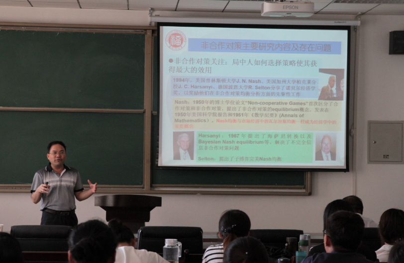 应我院李小南副教授与李碧老师邀请,6月17日下午福州大学李登峰教授、中国科学院数学与系统科学研究院胡晓东研究员在信远楼206报告厅分别做了题为“合作对策理论研究现状与发展趋势”和“算法博弈—优化与均衡”的学术报告,这两场报告由我院院长刘三阳教授主持。我院高淑萍教授、周水生教授、韩邦合副教授、李本崇博士及部分研究生参加了此次报告。此次报告是庆祝我校应用数学博士点获批二十周年系列学术活动之一。