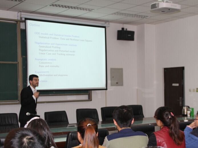 报告会上,Nicolas Brunel教授深入浅出地介绍了他在控制系统与解决常微分方程方面的最新研究成果。他从常微分方程控制系统讲起,详细介绍了这方面的几个重要模型以及模型中各种参数和光滑度之间的对比。他还从确定性的最佳系统控制可以有助于估计常微分方程的解的方面进行了细致的讲解。我们通常所解决的常微分方程的问题是已知常微分方程后来求解。而现在问题是已知方程的解可以观察出来,常微分方程的系数是未知的,我们如何应用控制方面的知识把这个问题得以解决。