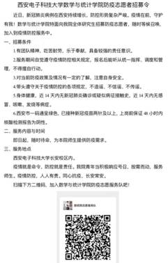 为保障各类工作顺利进行,学院动员全院上下,发布《给全体学生的疫情倡议书》,从疫情防控、心态稳定、投身抗疫等方面倡议全体学生积极应对疫情;发布防疫志愿者招募令,组建了党员抗疫先锋队,多名教师和学生积极活跃在抗疫工作中,为疫情下的校园稳定贡献力量;为了全力以赴做好疫情防控下的研究生考试工作,我院积极动员广大教职工报名,全体学院领导班子作为第一梯队带头参加,系主任、支部委员、工会组长、教工积极分子都积极响应,全院一共有20多名教职工确认参加,部分同志已经投入到前期社区志愿服务活动中。