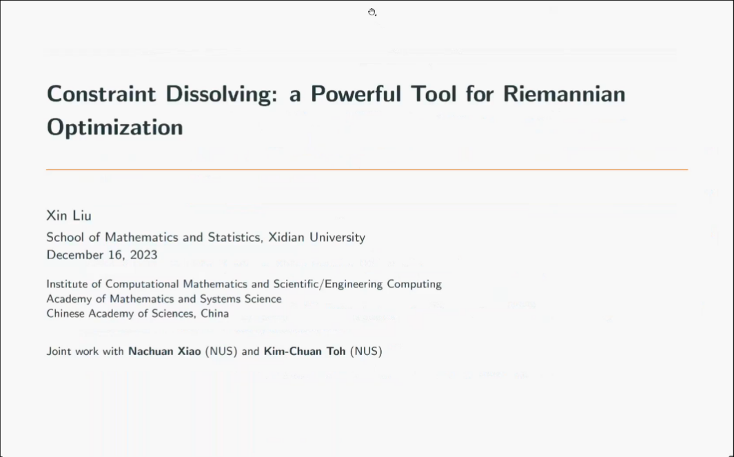 大会开幕式之后,举行了永利集团“2023最优化前沿论坛”,论坛分为四节,包括大会邀请报告及自由提问研讨环节。12月16日上午第一节,北京大学文再文教授、中国科学院数学与系统研究院刘歆研究员分别做了题为“An AugmentedLagrangianPrimal-Dual Semismooth Newton method for Multi-Block Composite Optimization”和“Constraint Dissolving Approaches for a Class of Riemannian Optimization Problems”的报告。
