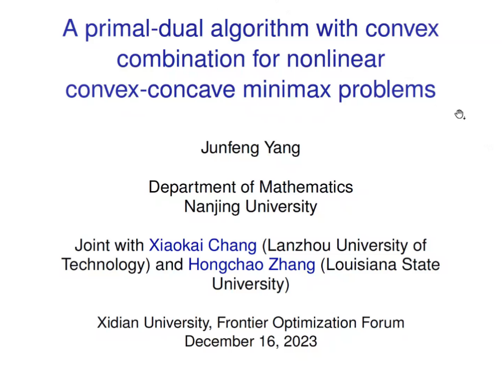(通讯员赵志华)2023年12月16日,永利集团举行“2023最优化前沿论坛”线上会议(腾讯会议:212-374-342)。会议得到了中国科学院数学与系统科学研究院、北京大学、香港中文大学、南京大学、南方科技大学和深圳大学等单位的大力支持。来自包括香港地区在内的全国各省市地区兄弟院校100名代表参加了此次会议。