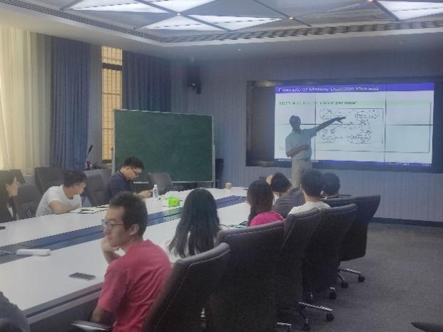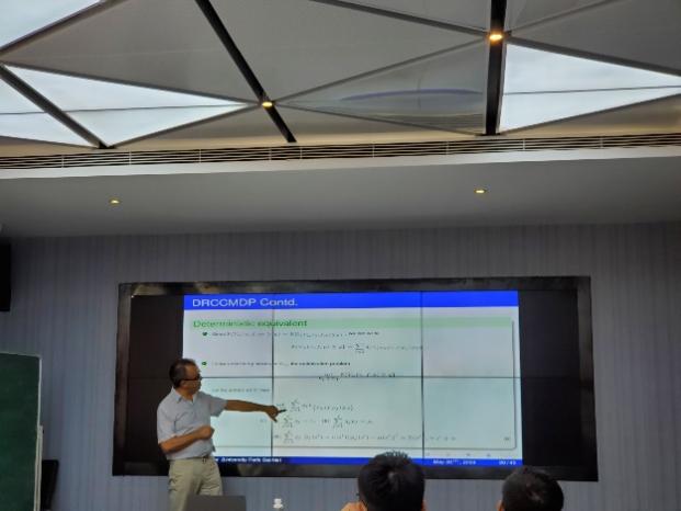 5月30日下午,AbdelLisser教授作了题为“Distributionally robust chance-constrained Markov decision processes”的学术报告。报告由青年教师彭深主持,应用数学与运筹学相关专业的青年教师和研究生等20余人参加了报告会。AbdelLisser教授由马氏决策入手,介绍了不同不确定集合下的分布式鲁棒机会约束马氏决策模型的转化、求解与应用。青年教师彭深,研究生李泽宇、介科伟等与专家就报告内容展开讨论,并就后续的科研合作进行探讨。报告结束后,多名学生与AbdelLisser教授合影留念。