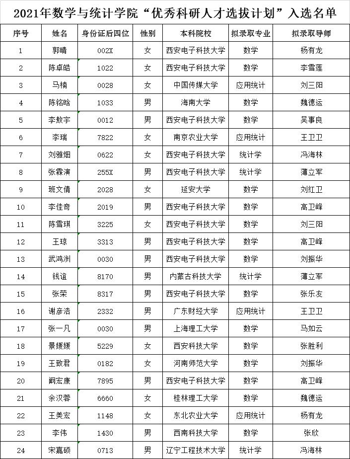 各位考生: 现公示2021年我院“优秀科研人才选拔计划”入选名单,公示时间为9月28日-10月10日,公示期间如有意见请向我院反应。 电话:029-81891379.