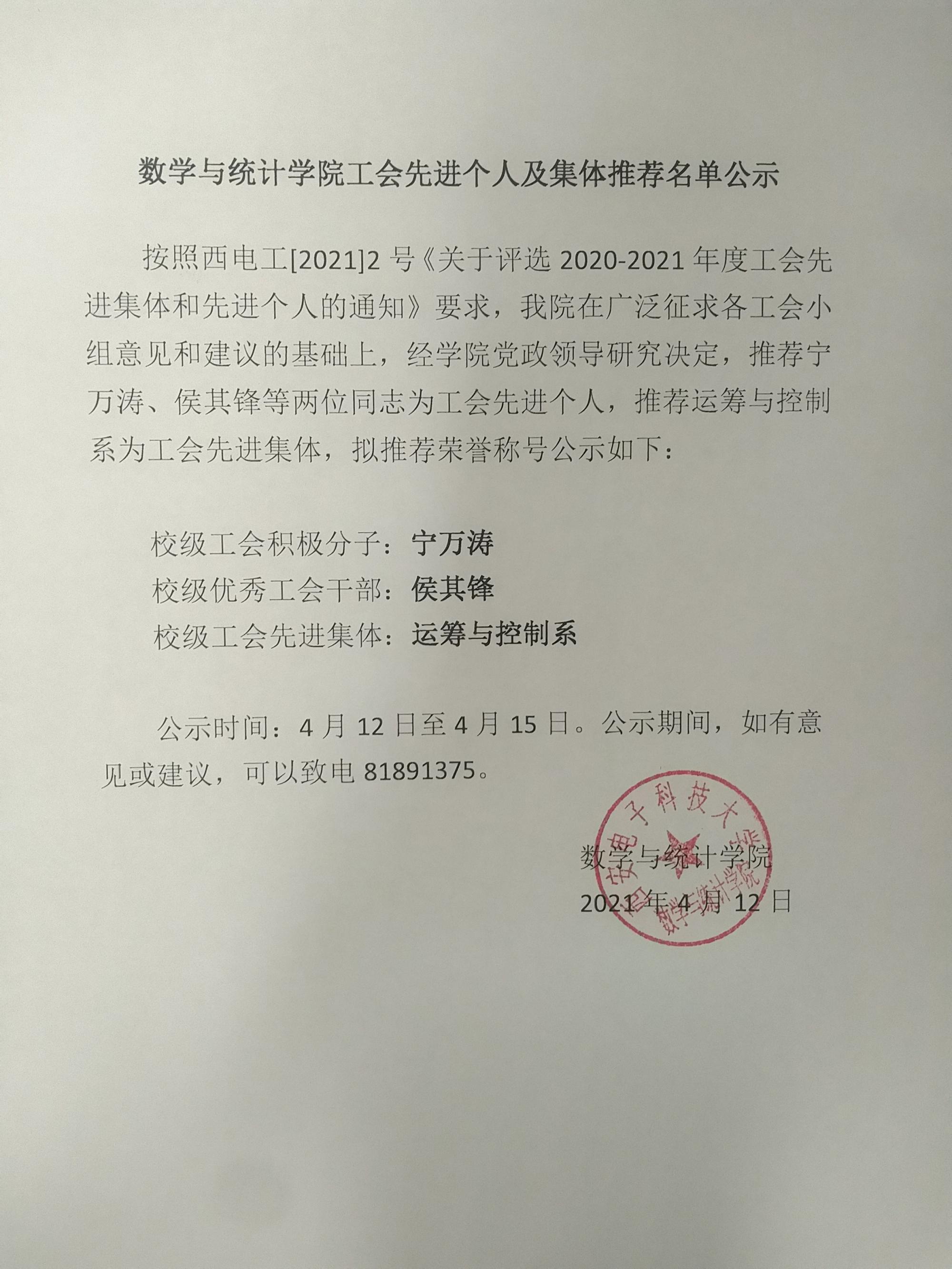 永利集团883042020-2021年度工会先进个人及集体推荐名单公示
