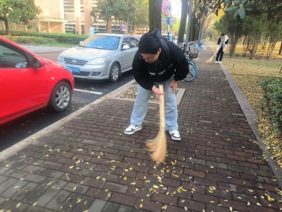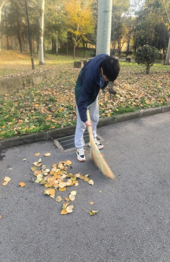 寒风乍起,校园的小径被落叶攻占,落叶无尽,层层叠叠,此次劳动实践教育活动内容是行政辅楼周围的落叶清扫。来到劳动工具领取处,同学们纷纷拿起事先准备好的笤帚、簸箕、耙子等工具,前往各自负责的区域。大家分工明确,有的负责清扫,有的负责清运,配合默契,展现了团队协作的力量,堆积的落叶在同学们的清扫下逐渐聚拢。经过一个多小时的努力,行政辅楼周围掉落的干枯树枝、落叶等垃圾被同学们清扫的干干净净。