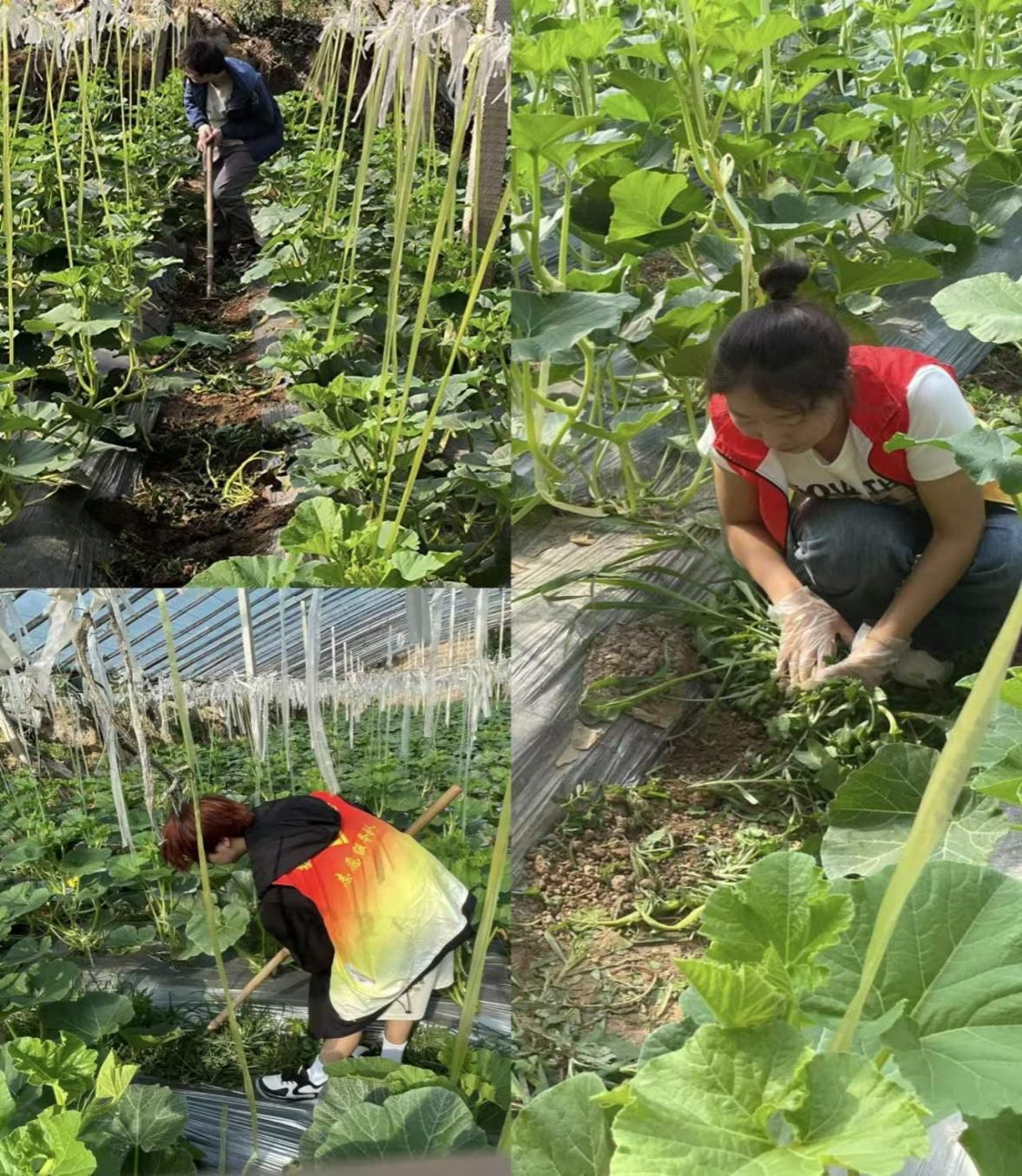 另一组志愿者则负责除草任务。他们手持除草工具,弯下腰,用力铲除园区内的杂草,确保蔬菜的生长环境干净整洁。大家分工明确,配合默契,短短几个小时内,大片菜地焕然一新。尽管除草是体力活,每位志愿者都是汗流浃背,但志愿者们都没有丝毫懈怠,他们用实际行动诠释了志愿者的奉献精神。潘从同学一边擦汗,一边兴奋地说“这次志愿服务,我们近距离的接触了农作物,给瓜果除草拔蒜苗,在这个过程中我们深刻体会到了劳动人民的艰辛,20多度的环境里,温室大棚的温度就近50度,站在里面就能感受到铺天盖地的热浪,一番劳作,同学们个个挂满了汗珠。经过工作人员讲解农作物的种植过程、成熟周期以及各个月份的时令果蔬,了解到了许多生活中的知识,收获颇丰。”23级海阳同学说“在本次的劳动实践中,我充分体会到了劳动的艰辛与不易,同时也被农民们的辛勤程度深深震撼。我参与了扒蒜工作,在炎炎夏日,我干了三个小时,便汗如雨下,筋疲力尽,但他们起早贪黑,顶着烈日,除草施肥,悉心照料庄稼。因此,我们必须要珍惜食物,时刻谨记粒粒皆辛苦的道理。”