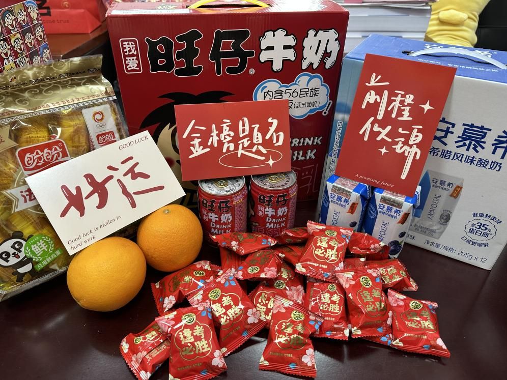 此次送温暖活动,学院为每一位2025届考研学子准备了寓意美好的“考研加油包”,加油包中包括了寓意“心想事成”的橙子、“考运旺旺”的旺仔牛奶、“所得所盼”的盼盼面包、印有“逢考必胜”字样的棉花糖等,为了将美好的祝愿送给广大考研学子,学院领导、老师和学弟学妹们还亲手编辑了祝福明信片,以此传递对考研学子的殷切期望,愿他们以最好的状态迎接挑战,考研顺利,金榜题名!