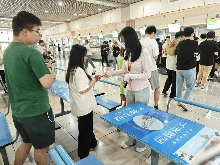 为配合学校“一元餐”政策的顺利实施,美好食光引导员岗位的同学们在食堂开展了秩序维护、文明倡导等工作。同学们热情引导就餐人员有序排队,提醒大家按需取餐、避免浪费。同时,他们还收集同学们对食堂菜品的建议,并及时反馈给后勤部门,架起了学生与食堂之间的沟通桥梁。“看到同学们在引导下自觉排队、节约粮食,我觉得我们的付出很有意义。”李晓敏同学说道。此外,引导员们还协助规范自行车停放,确保食堂周边环境整洁有序。他们的辛勤付出,让食堂就餐环境更加和谐,也让“光盘行动”深入人心。