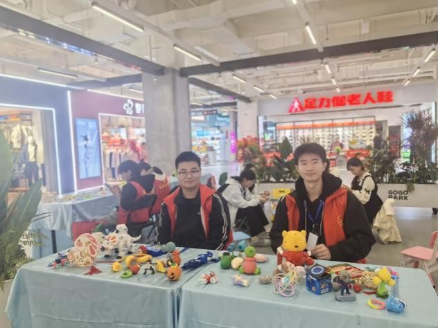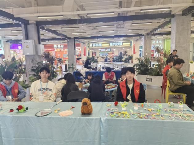 活动伊始,志愿者们早早来到现场,分工明确、紧密协作,从布置摊位到摆放物品,从宣传海报到互动环节,处处都能看到他们忙碌的身影。义卖摊位上摆放着一件件色彩鲜艳、造型独特的手工艺品——有由扭扭棒精心编制的花束、动物摆件,也有同学们捐赠的玩具与小饰品。这些作品不仅凝聚着同学们的巧思与心意,更承载着他们对公益事业的热忱。