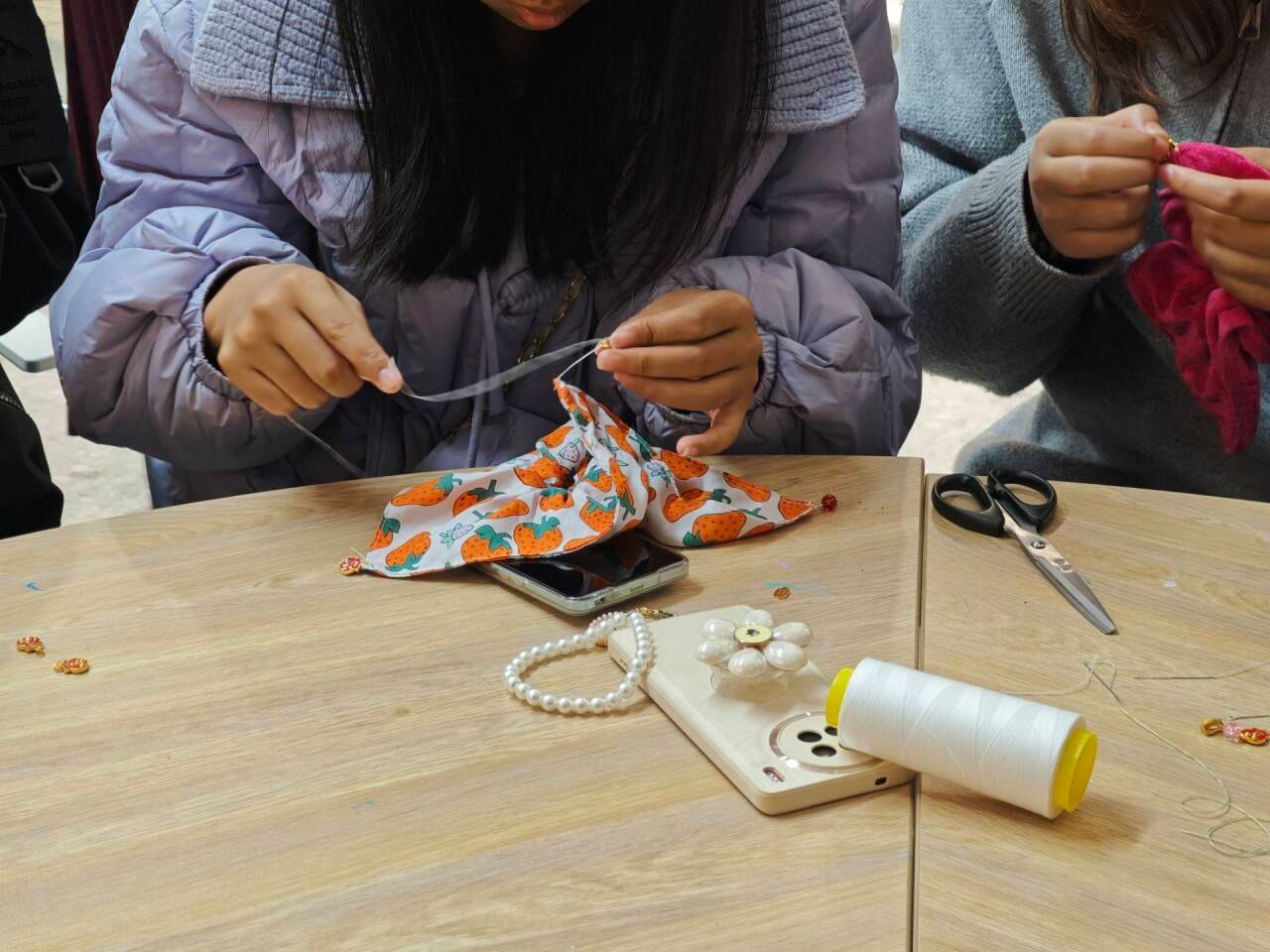 活动伊始,学子们准时抵达社区活动场地,有序领取物料与工具,迅速投入创作之中。面对简单单调的布料,同学们灵活调整设计方案,打造出各具特色的作品。制作过程中,有人擅长穿绳技巧,便主动分享经验;有人精通配饰搭配,便为同伴提供创意建议。遇到困难时,大家共同探讨解决方案。这不仅是一次手工实践,更是一次团队协作与友谊的升华。经过两小时的专注创作,一批造型别致、充满创意的手工发绳顺利诞生。本次活动未额外采购材料,完全依托社区闲置资源,真正实现了“变废为宝”的环保目标。同学们在锻炼动手能力与创新思维的同时,也深刻体会到资源再利用的价值与意义。