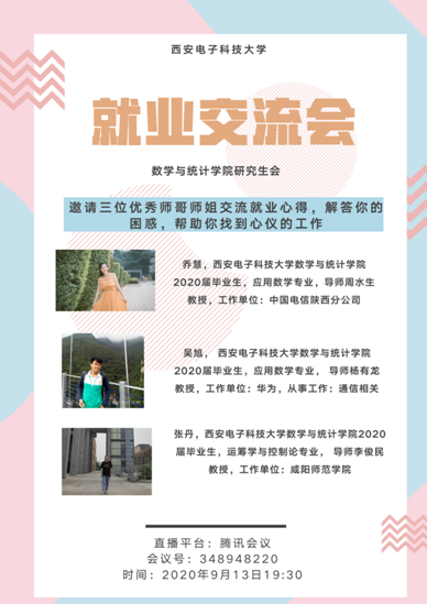 9月13日19:30,永利集团88304研究生会负责举办的就业经验交流分享会于线上开展,参加此次会议的有院党委副书记王佩、院辅导员孙群、数统院18级究生及部分19级、20级研究生,会议吸引了超100人参与。学院邀请了三位优秀的2020届毕业研究生代表分享他们的就业经验,帮助大家解答关于就业方面的困惑。