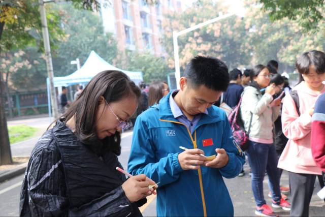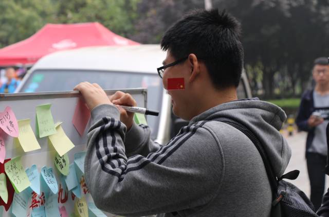 中午十二时,随着同学们陆续放学,活动现场的人也很快多了起来。每个团委学生会的工作人员的脸上都贴着一面小红旗,他们一边向过路的同学发放党的十九大的宣传单页,一边介绍我们的活动,邀请他们参与到我们的活动中来。而每个参与到活动中来的同学,都能获得一个五星红旗贴纸,将对祖国的祝福与热爱,化为贴纸,贴在笑脸上。