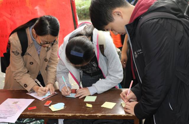 随后,每个人将在活动横幅上签下自己的名字。最后,每个人将在小纸片上写下对祖国的祝福,并将其贴在展板上面。