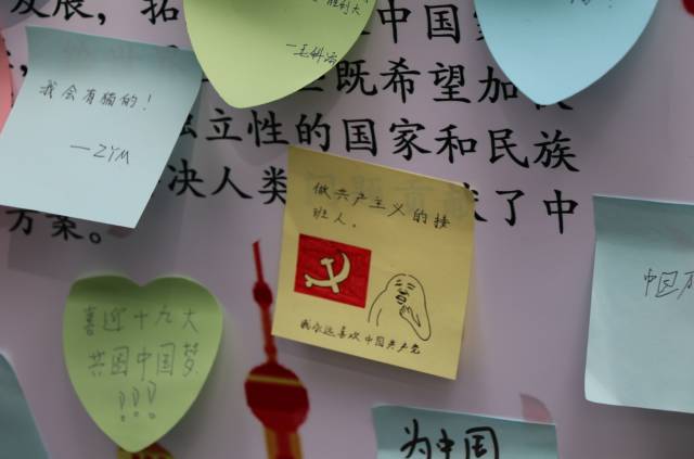 下午一时,数统院团委书记靳志伟,17级指导员赵春霞老师也来到了活动现场,与他们一同前来参加活动的还有16,17级的部分团员。大家围站在横幅前,签下自己的名字,写下对祖国的祝福,感受着党的十九大的喜庆气氛。