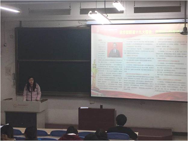 常老师从大学生要学习贯彻党的十九大精神报告精神出发,跟同学们一起学习党的十九大报告中一系列新思想、新论断、新提法、新举措,常老师就报告中切实增强学习贯彻习近平新时代中国特色社会主义思想的政治自觉、思想自觉和行动自觉,把思想和行动统一到习近平新时代中国特色社会主义思想上来,她倡导同学们宣传好党的十九大精神,听党话跟党走,以实际行动贯彻落实党的十九大精神,凝聚起同心共筑中国梦的磅礴力量。