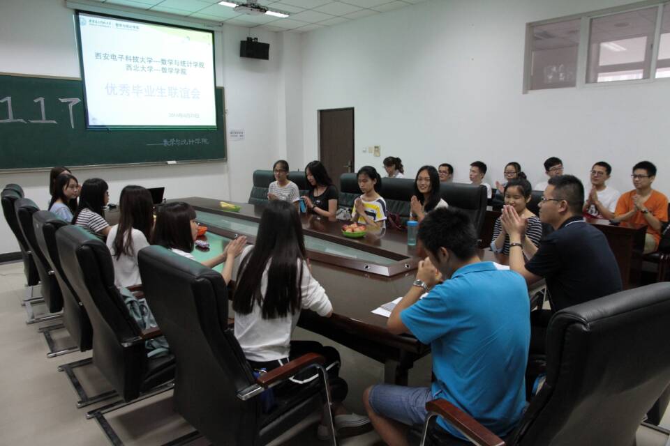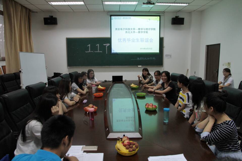 2016年6月23日上午九点半,在永利集团88304信远2区205会议室,西电永利集团88304“117”宿舍与西北大学数学学院“117”宿舍的姑娘们举行了优秀毕业生宿舍联谊座谈会,参加座谈会的还有两院毕业班的辅导员靳志伟、朱家栋老师以及数统院低年级的学生代表,大家一起见证了两个宿舍同学们奋斗中的幸运,分享了巧合中的共性。