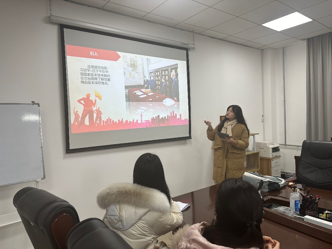 薛睿围绕中国文化源远流长,中华文明博大精深进行主题宣讲。她带领大家深刻解读了习近平总书记从五个方面对中华民族现代文明的重要元素和突出特性。第一是延续性。“源浚者流长,根深者叶茂。” 第二是创新性。中华文明是革故鼎新、辉光日新的文明,静水深流与波澜壮阔交织。第三是统一性。中华文明长期的大一统传统,形成了多元一体、团结集中的统一性。第四是包容性。正所谓“海纳百川,有容乃大”。 第五是和平性。中华文化强调“文”,文为本,化为用,以文化人,以文化天下。“第二个结合”是习近平总书记对马克思主义中国化时代化作出的新的原创性贡献。历史正反两方面的经验表明,“两个结合”是我们取得成功的最大法宝。“两个结合”开辟了马克思主义中国化时代化的新境界,是建设中华民族现代文明的根本保证。