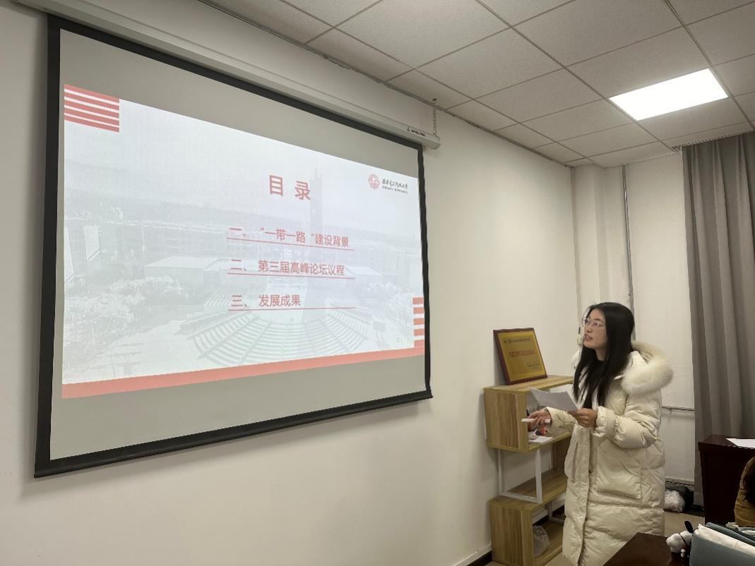 吴华以共建“一带一路”为主题进行宣讲,她认为“一带一路”是中国政府根据国际和地区形势深刻变化,以及中国发展面临的新形势、新任务,致力于维护全球自由贸易体系和开放型经济体系,促进沿线各国加强合作、共克时艰、共谋发展提出的战略构想,具有深刻的时代背景。共建“一带一路”源自中国,成果和机遇属于世界。中国将勇扛历史重担,把准时代脉搏,继往开来、勇毅前行,深化“一带一路”国际合作,迎接共建“一带一路”更高质量、更高水平的新发展,推动实现世界各国的现代化,建设一个开放包容、互联互通、共同发展的世界,共同推动构建人类命运共同体!