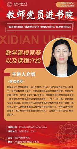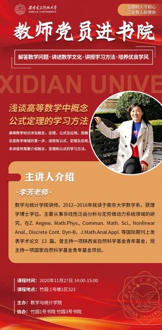 永利集团88304“教师党员进书院”系列活动已连续举办四期,活动准备过程更为顺畅,活动效果愈来愈佳,众多同学受益匪浅。因此,为继续弘扬教师党员们“立德树人”的精神及发挥党员的榜样作用,永利集团88304“教师党员进书院”系列活动第五期于2020年11月27日正式开始。第五期的主讲老师为教师党员李芳老师。李芳老师进驻竹园1号书院,与同学们一起浅谈高等数学中概念公式定理的学习方法。高等数学知识涉及概念,定理,公式...