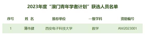 近日,全国博士后管委会公布了2023年度“澳门青年学者计划”获选结果,确定30名获选人员和5名候补人选,永利集团88304博士后薄伟健入选,是学校今年该计划唯一的入选者,同时,也是国内数学学科领域今年该计划唯一的入选者。据悉,“澳门青年学者计划”由全国博士后管委会办公室和澳门科学技术协进会联合实施。每年选派内地优秀博士到澳门指定高校及科研机构开展为期2年的博士后研究工作,项目资助经费为每人36万元人民币和4...