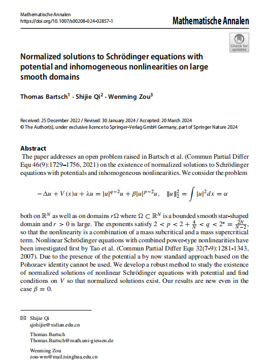 近日,西电永利集团88304祁世杰教师与德国著名数学家Thomas Bartsch 教授、清华大学邹文明教授合作,在数学领域顶级期刊Mathematische Annalen上发表了题为“Normalized solutions to Schrödinger equations withpotential and inhomogeneous nonlinearities on large smooth domains”的长达47页的学术论文。 Mathematische Annalen 创建于1868年,致力于发表纯数学各领域具有突破性的重要成果,是业内公认的数学类顶级期刊,...